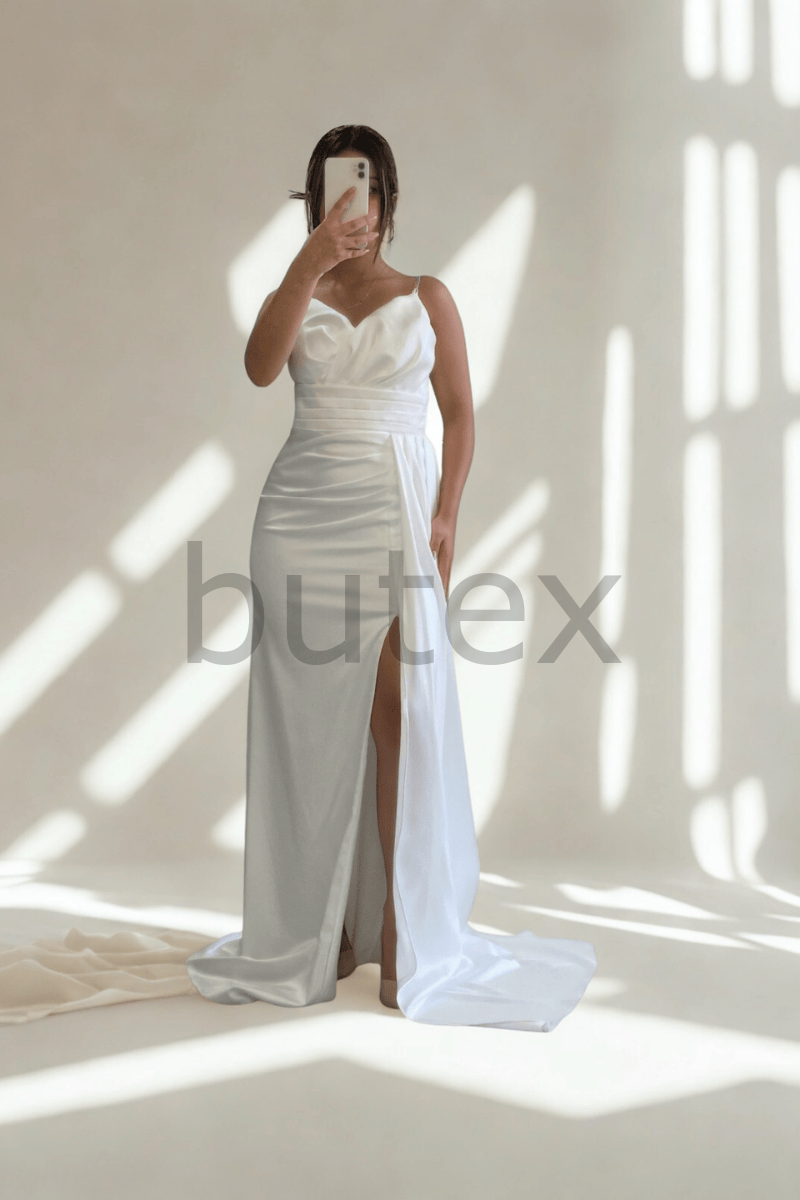 Uzun saten elbise, zarif ve şık tasarımı ile özel davetlerin vazgeçilmezi. Arkası bağcıklı yapısı ve önden yırtmaç detayı sayesinde feminen siluet sunar. Bel kısmındaki drapeler, tam kalıp kesimle birleşerek kusursuz bir duruş sağlar. Rahat ve göz alıcı bir seçenektir.BEDEN TABLOSU İÇİN TIKLAYINIZ