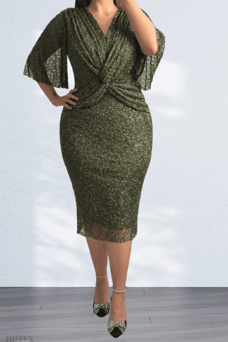Boru boncuk işlemeleriyle süslenmiş, önü düğüm detaylı midi boy büyük beden abiye elbise. Likralı kumaşı sayesinde rahat hareket imkanı sunar. Dar kalıp tasarımıyla vücuda oturur; kendi bedeninizin bir beden büyüğünü tercih etmeniz önerilir. Işıltılı ve şık görünüm sağlar.BEDEN TABLOSU İÇİN TIKLAYINIZ.