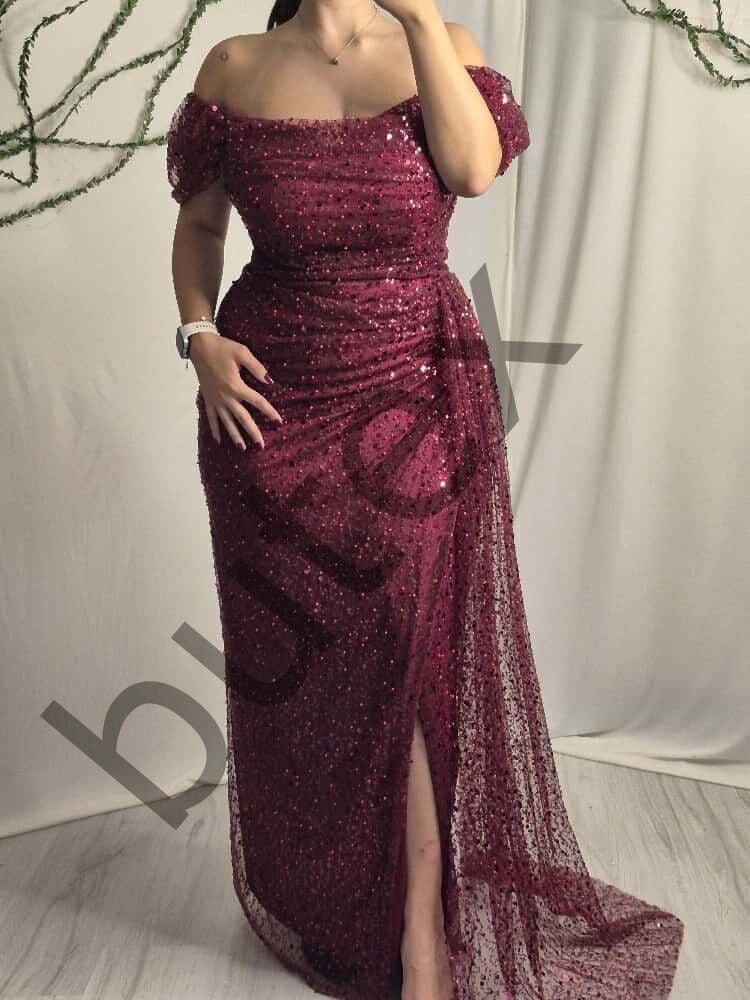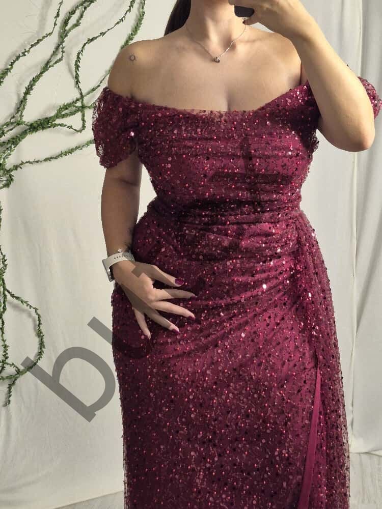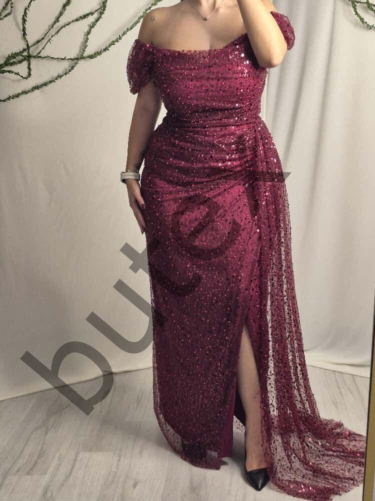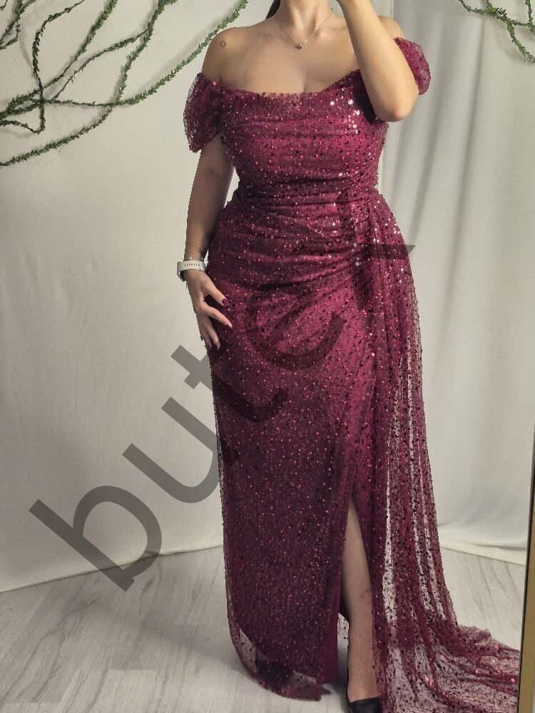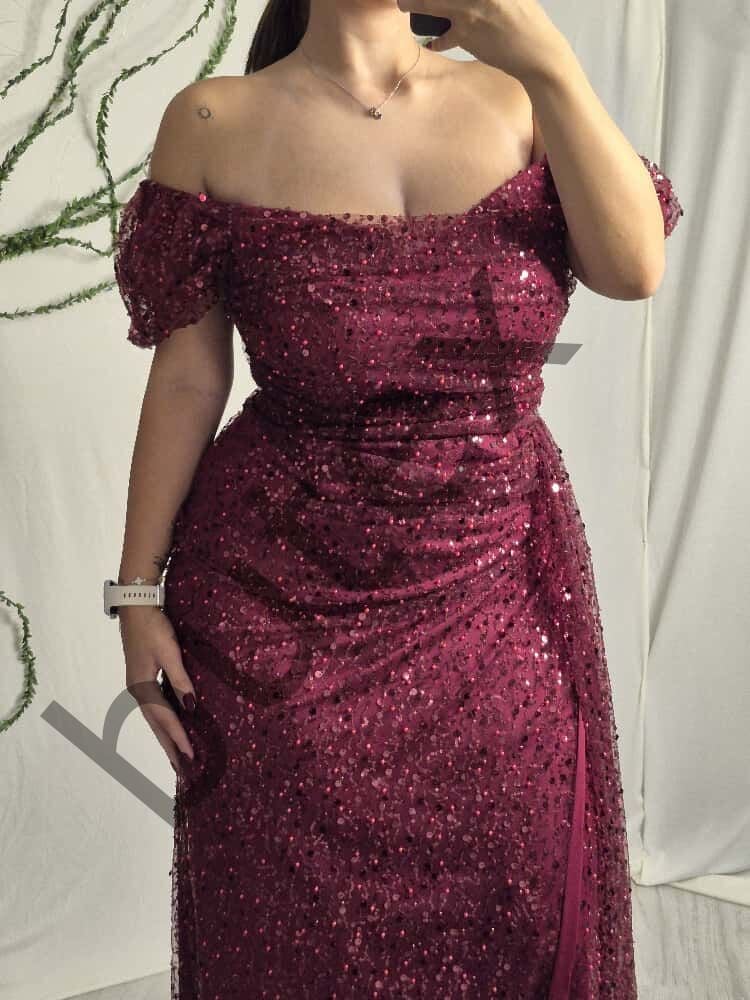 Boncuklu kumaştan tasarlanmış uzun abiye elbise, yandan kuyruk ve kapalı yırtmaç detaylarıyla zarif bir görünüm sunar. Düşük kol ve kayık yaka formu, büyük bedenlere özel şıklık ve konfor sağlar. Özel gecelerde dikkat çekmek isteyenler için idealdir.BEDEN TABLOSU İÇİN TIKLAYINIZ