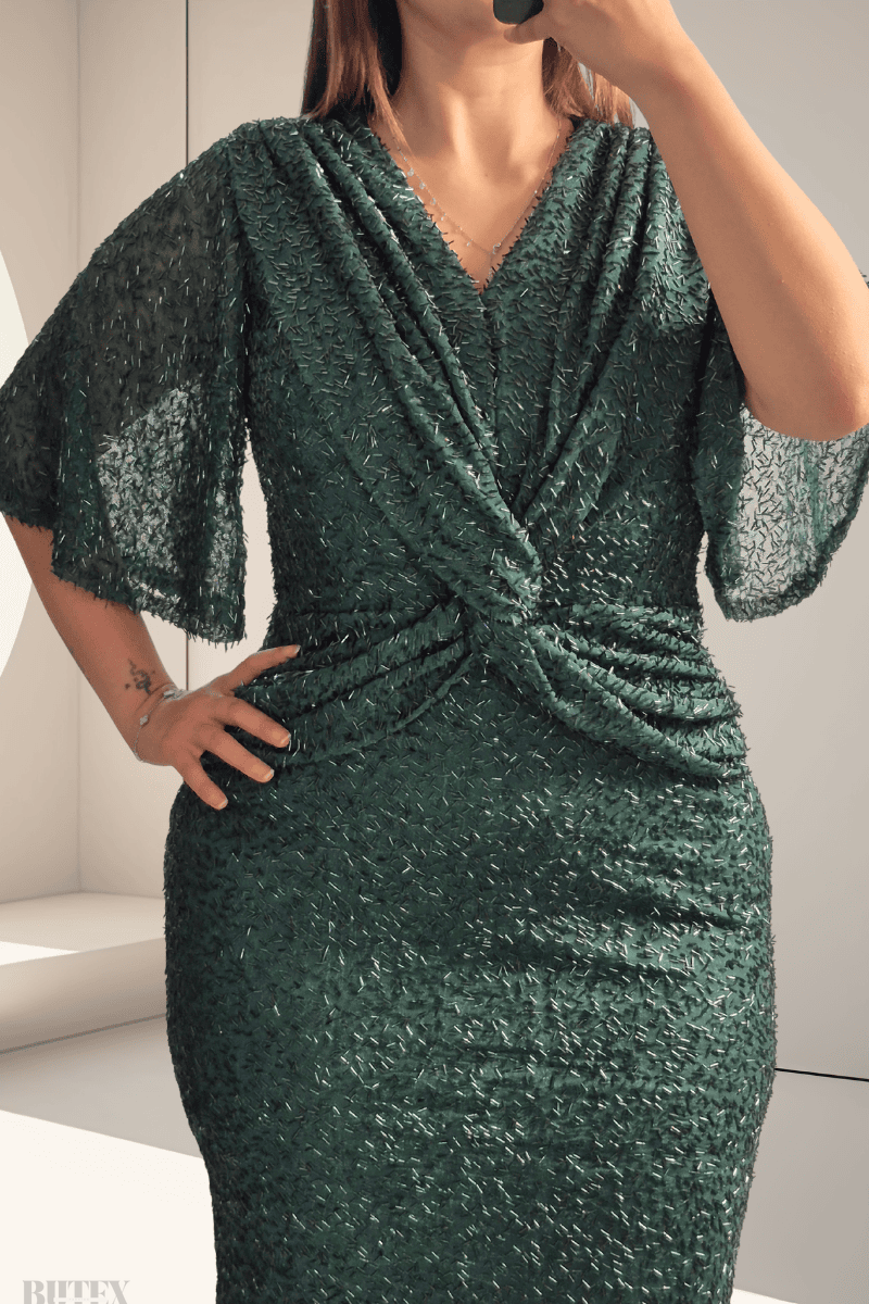 Boru Boncuklu Önü Bürümcük Büyük Beden Abiye Elbise 1134btx ZÜMRÜT YEŞİLİ - 44