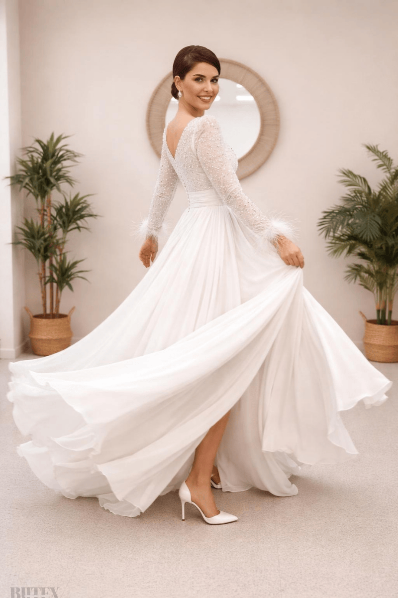 Büyük beden şifon abiye elbise, zarif tasarımı ve rahat kesimiyle özel davetlerin vazgeçilmezi. Kol uçları otrişli, sırt ve yakası V kesim detaylarıyla şıklığıyla ön plana çıkar. Hafif ve nefes alabilir kumaşı, gün boyu konfor sağlar.