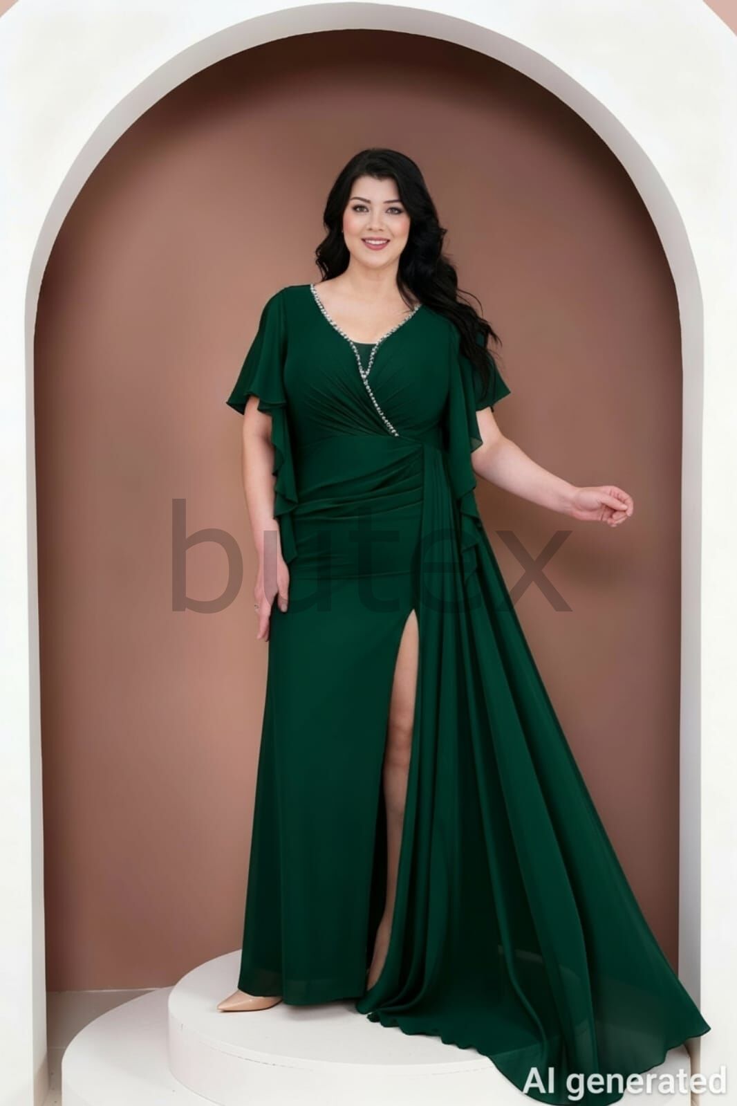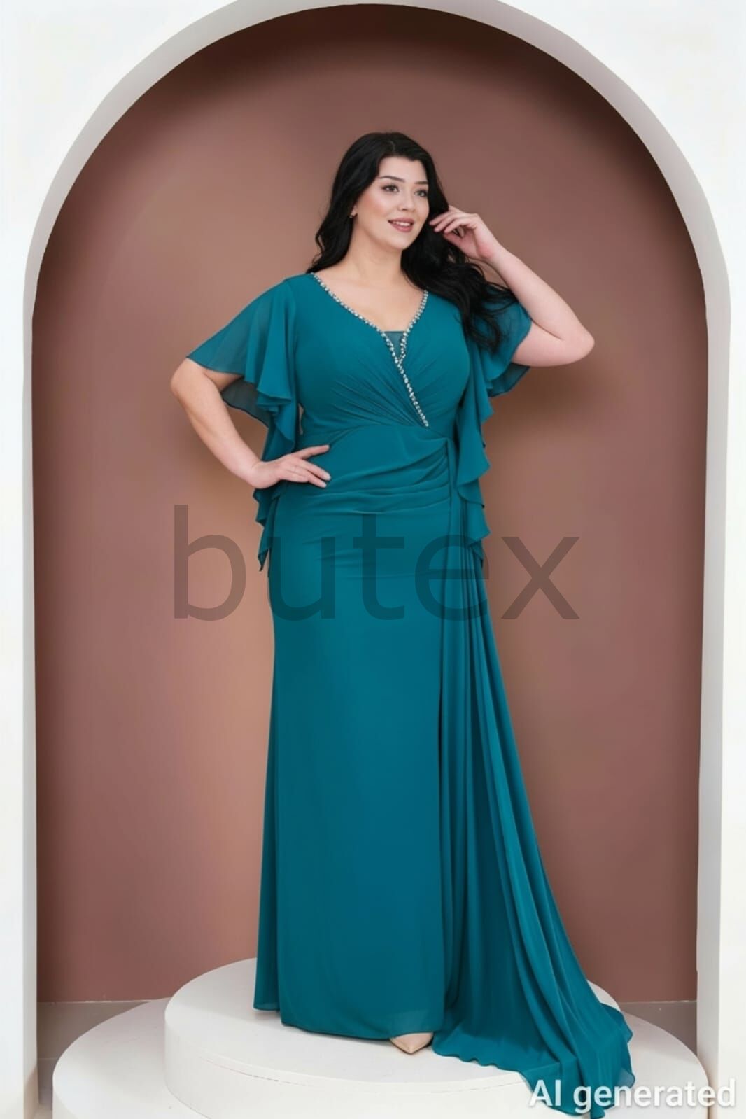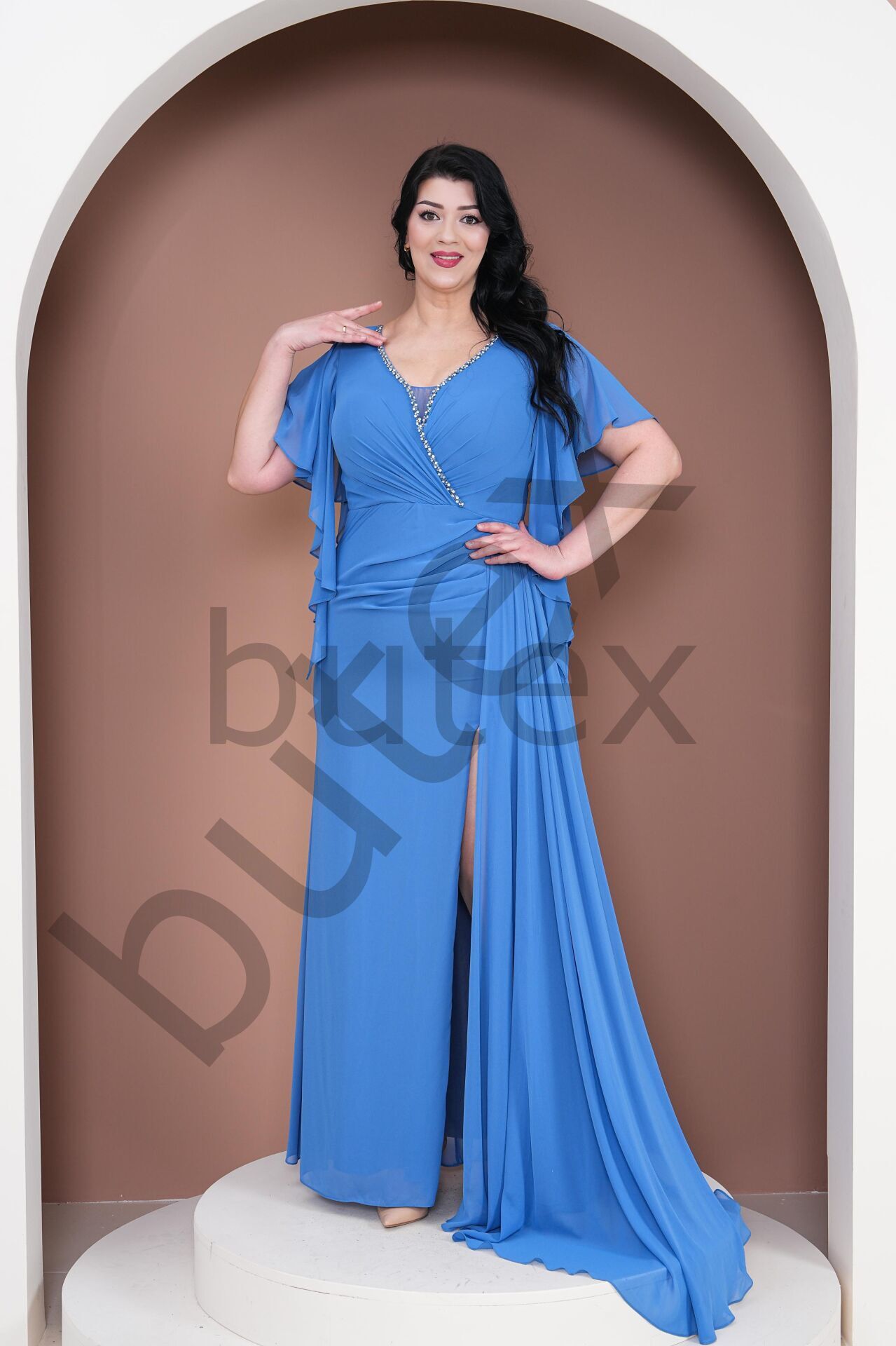 V yaka, taş detaylı yaka kenarları ve volanlı kollarıyla şıklığı yakalayan şifon büyük beden abiye elbise, derin yırtmaç ve dekolte tasarımıyla göz alıcı bir duruş sunar. Konforlu ve zarif bir seçim olarak özel davetlerde öne çıkmak isteyenlerin favorisi BEDEN TABLOSU İÇİN TIKLAYINIZ