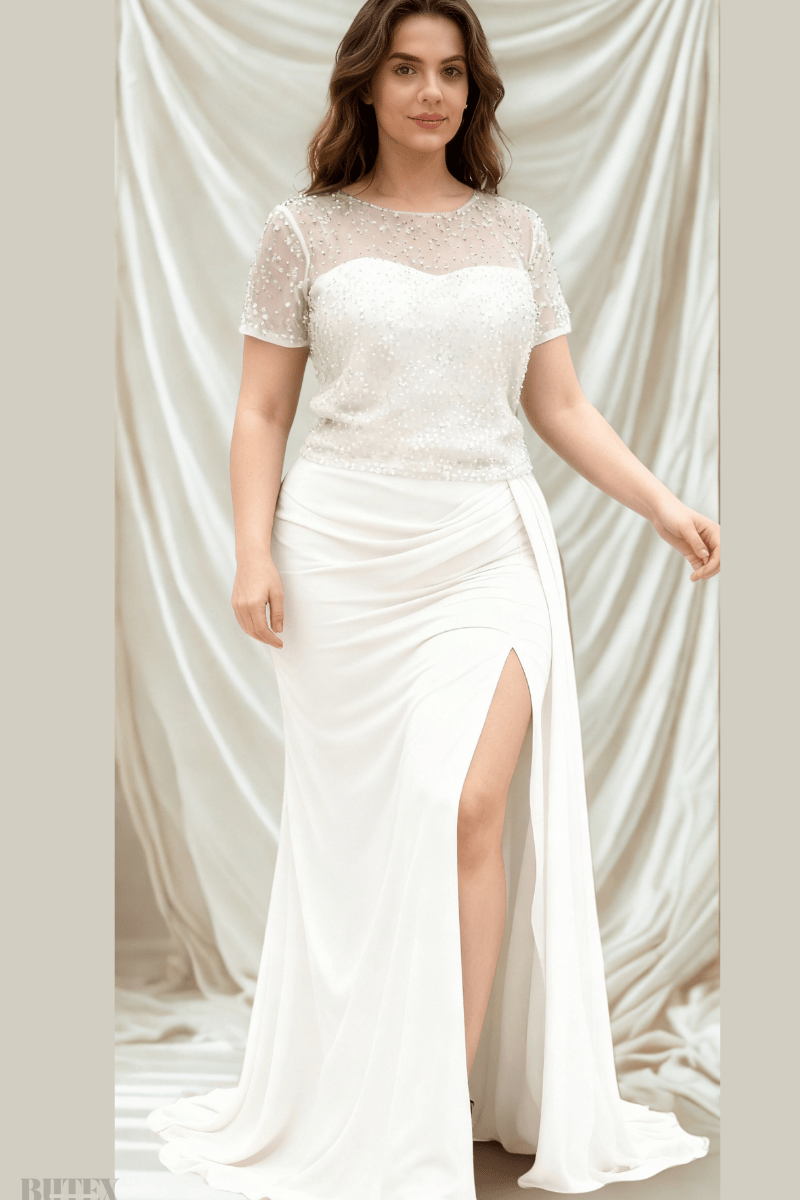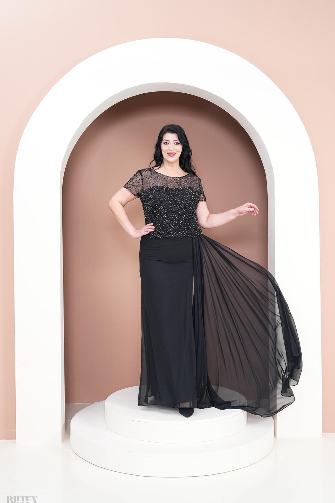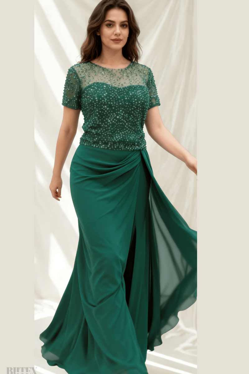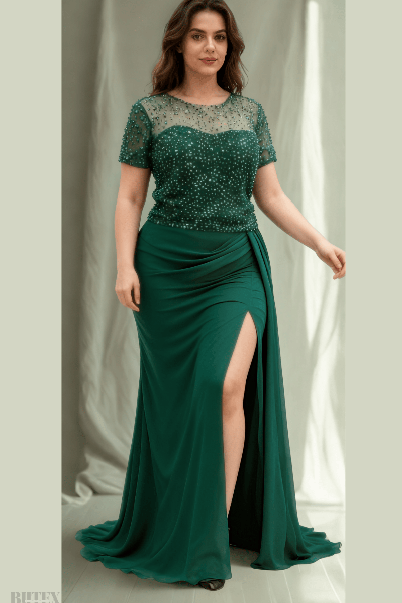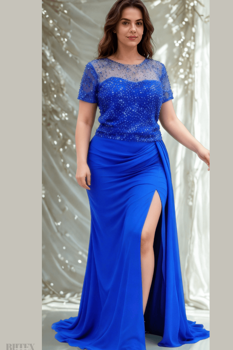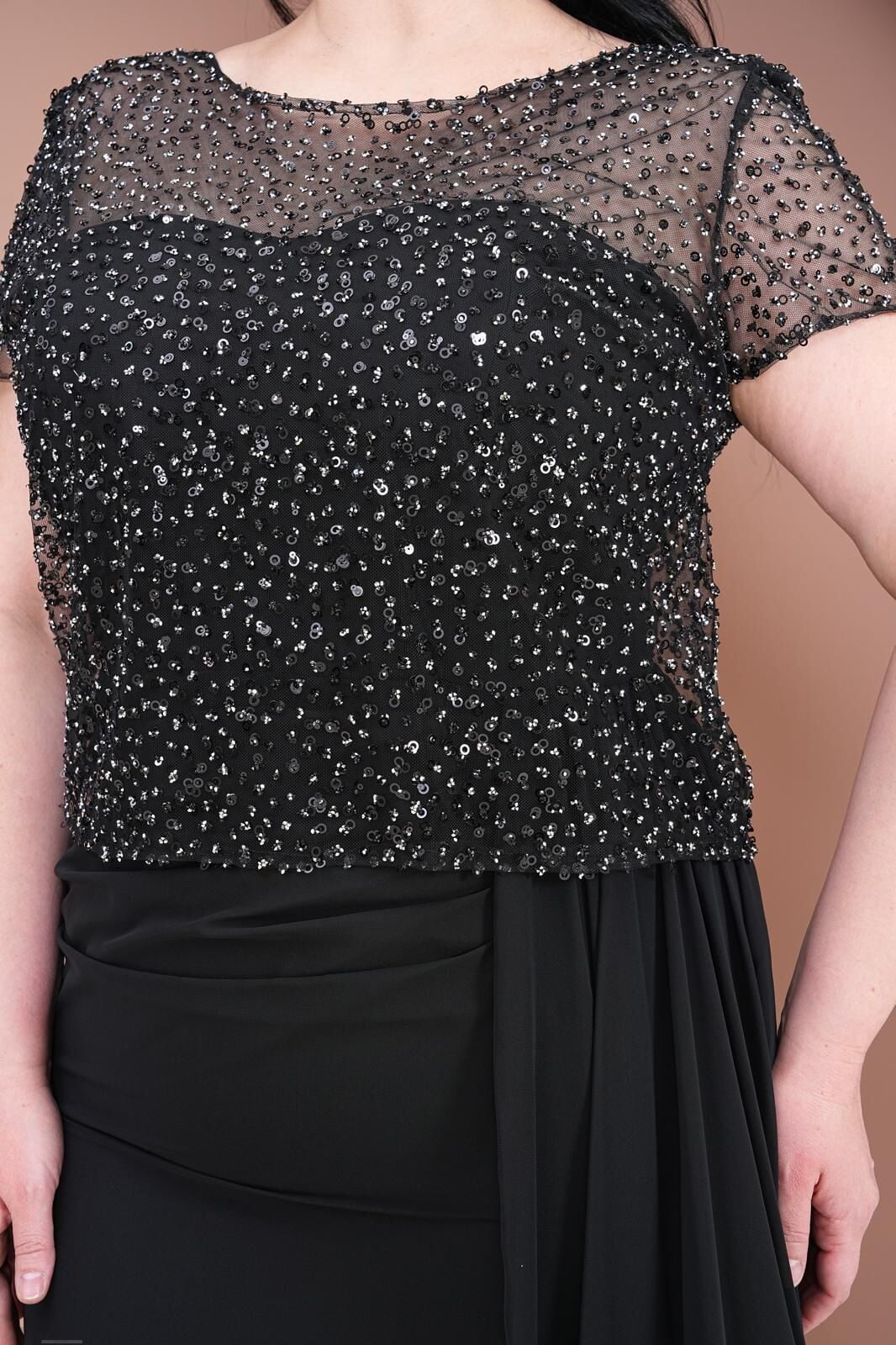 Büyük Beden Üstü Pullu Altı Şifon Abiye Elbise 2796btx