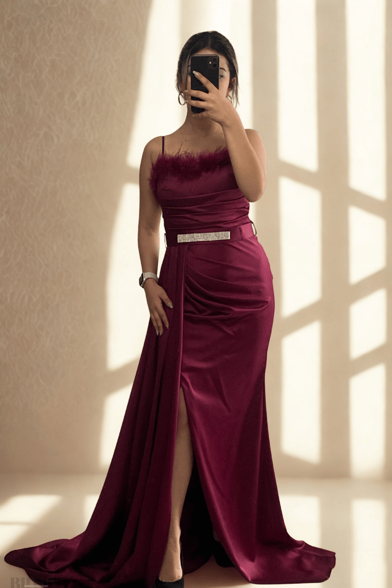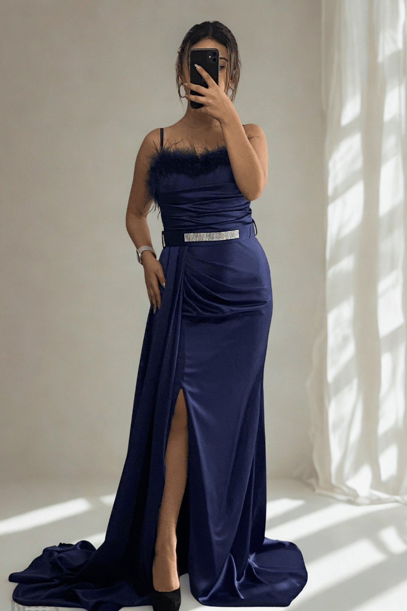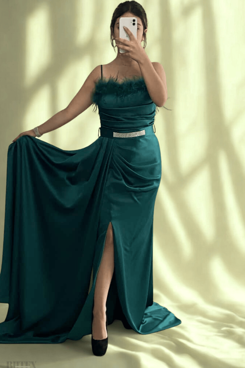Göğsü Otrişli Bel Kemerli İp Askılı Saten Uzun Abiye Elbise 9698btx