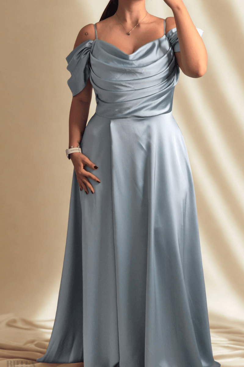 İp Askılı Düşük Kol Kapaklı Yırtmaç Uzun Saten Abiye Elbise 9874btx