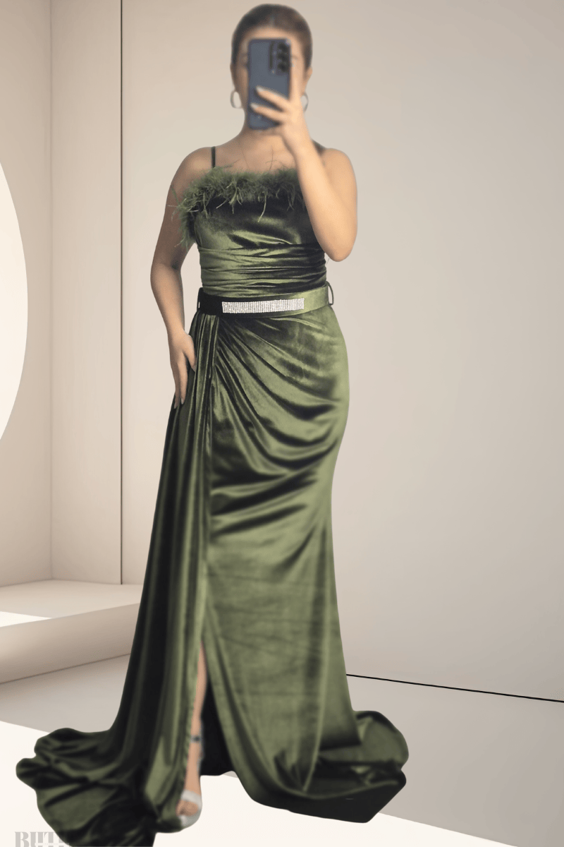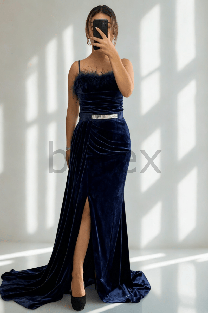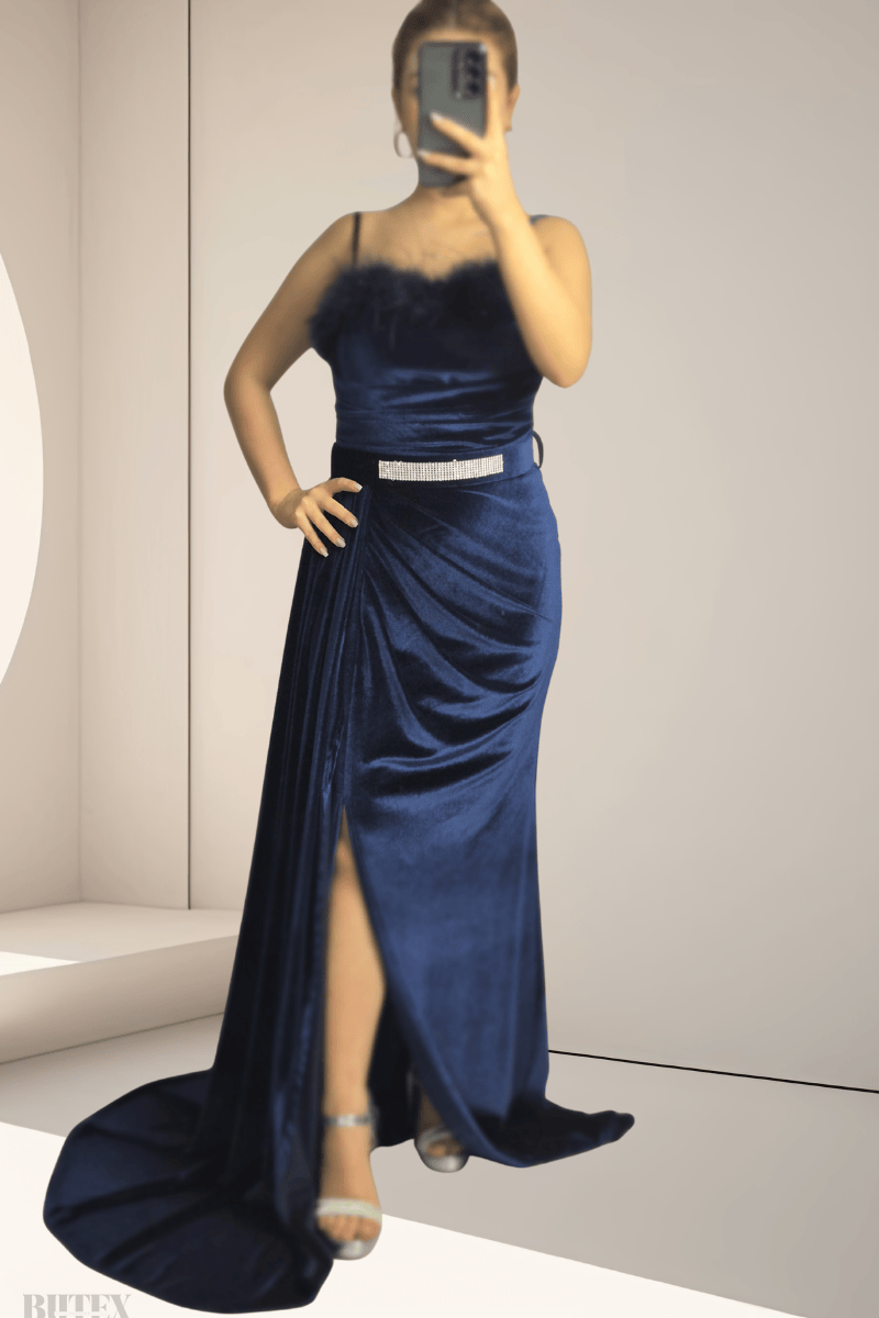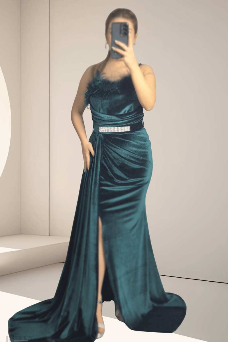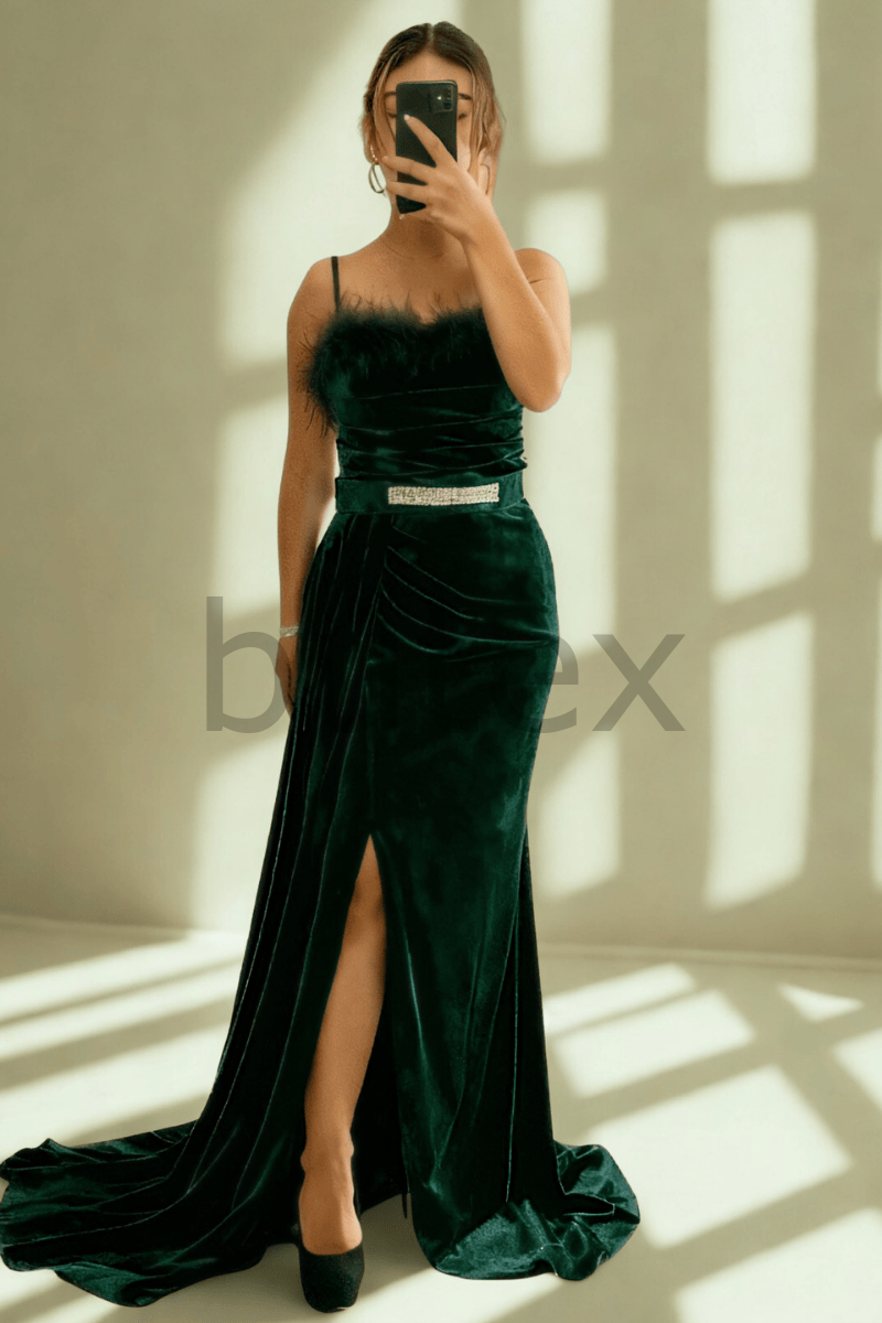 Kadife kumaşın şıklığını yansıtan uzun abiye elbise, beli kemer aksesuarlı ve önde zarif yırtmaç detaylarıyla dikkat çeker. Önden yırtmaç ve kuyruğu sayesinde asil ve çekici bir duruş sunar, özel günler için mükemmel bir tercih sağlar.BEDEN TABLOSU İÇİN TIKLAYINIZ