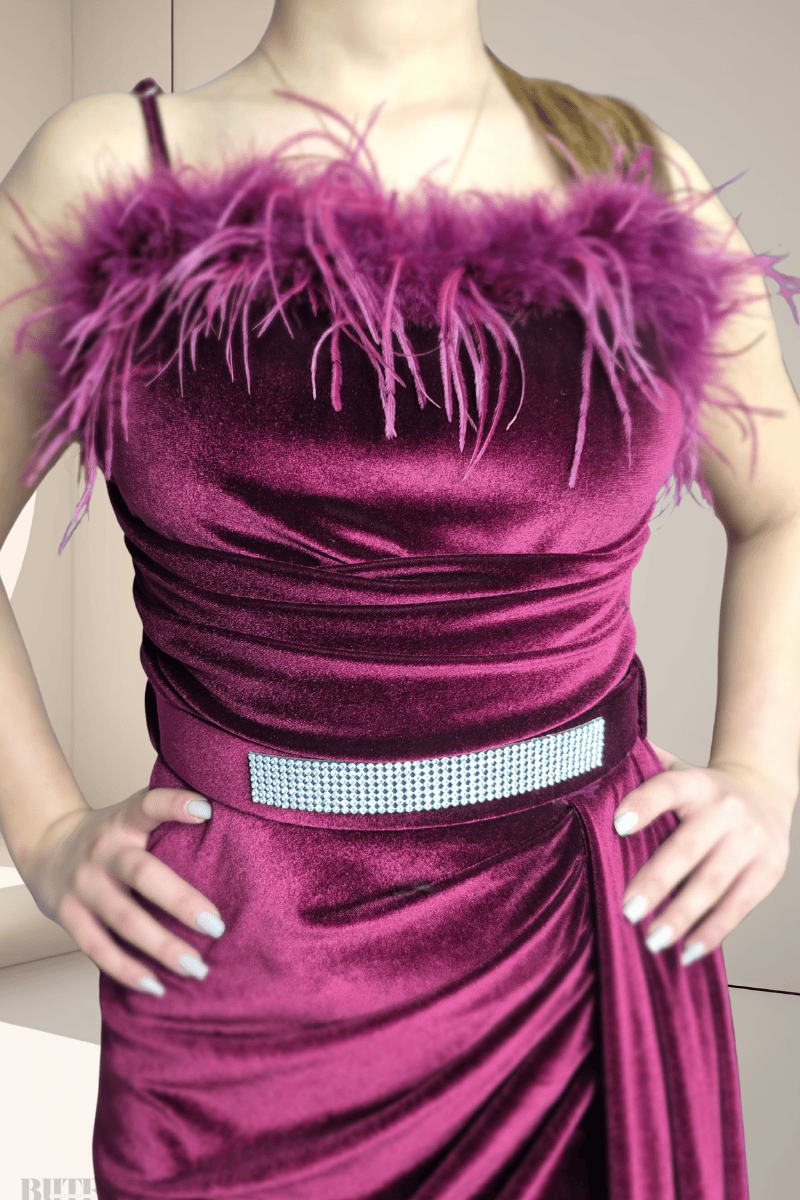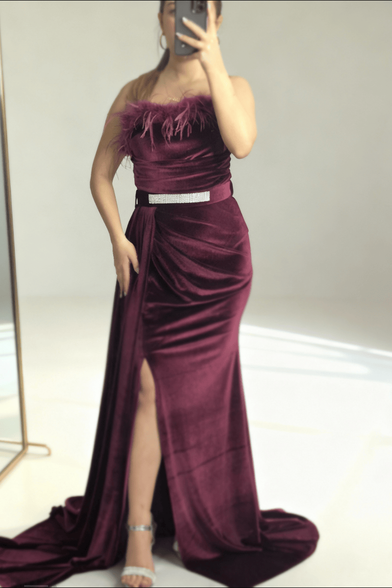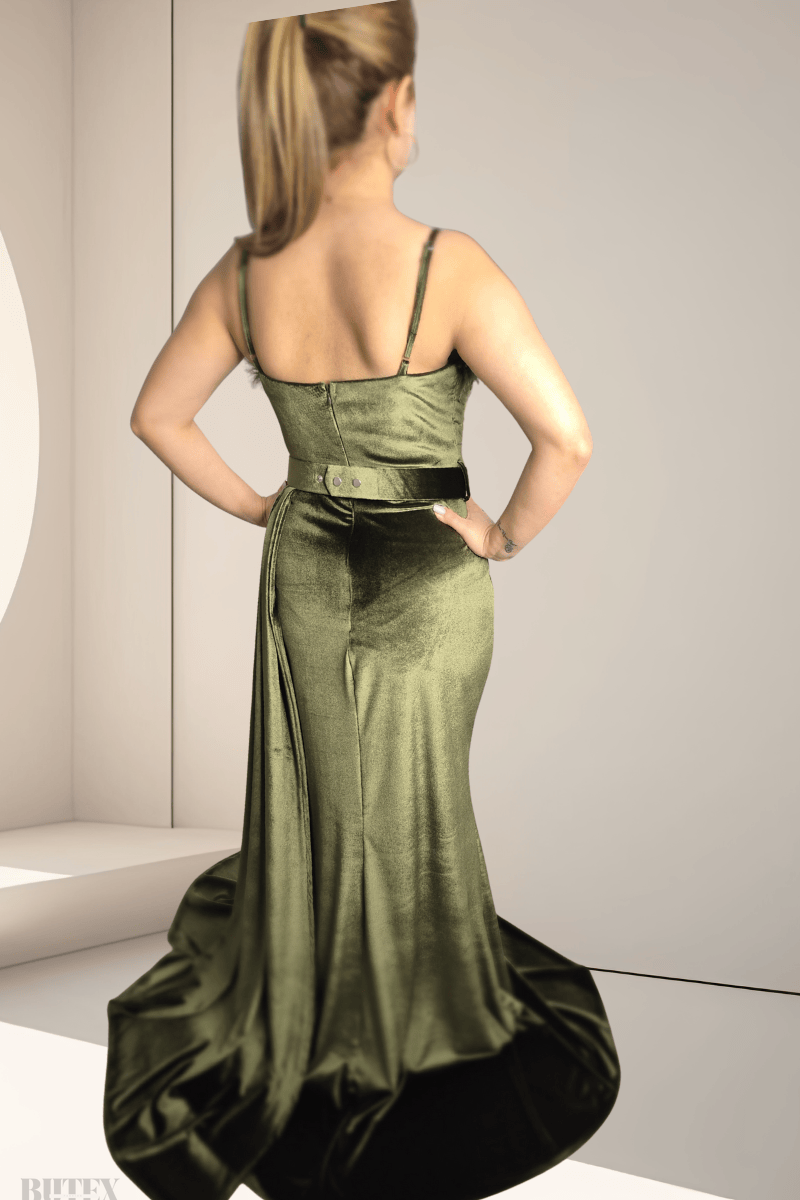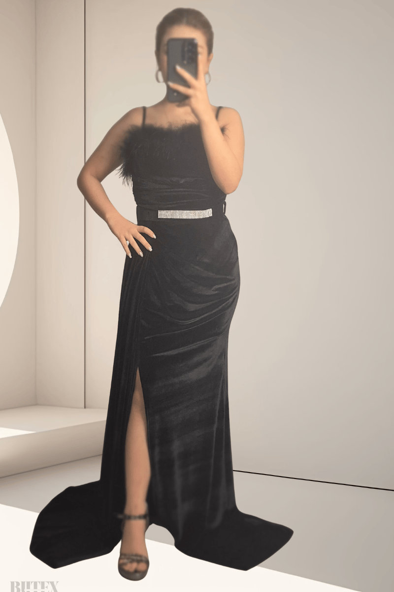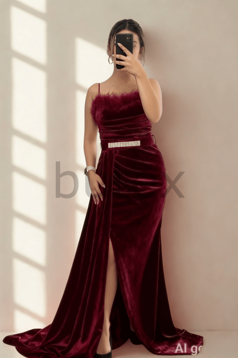 Kadife kumaşın şıklığını yansıtan uzun abiye elbise, beli kemer aksesuarlı ve önde zarif yırtmaç detaylarıyla dikkat çeker. Önden yırtmaç ve kuyruğu sayesinde asil ve çekici bir duruş sunar, özel günler için mükemmel bir tercih sağlar.BEDEN TABLOSU İÇİN TIKLAYINIZ