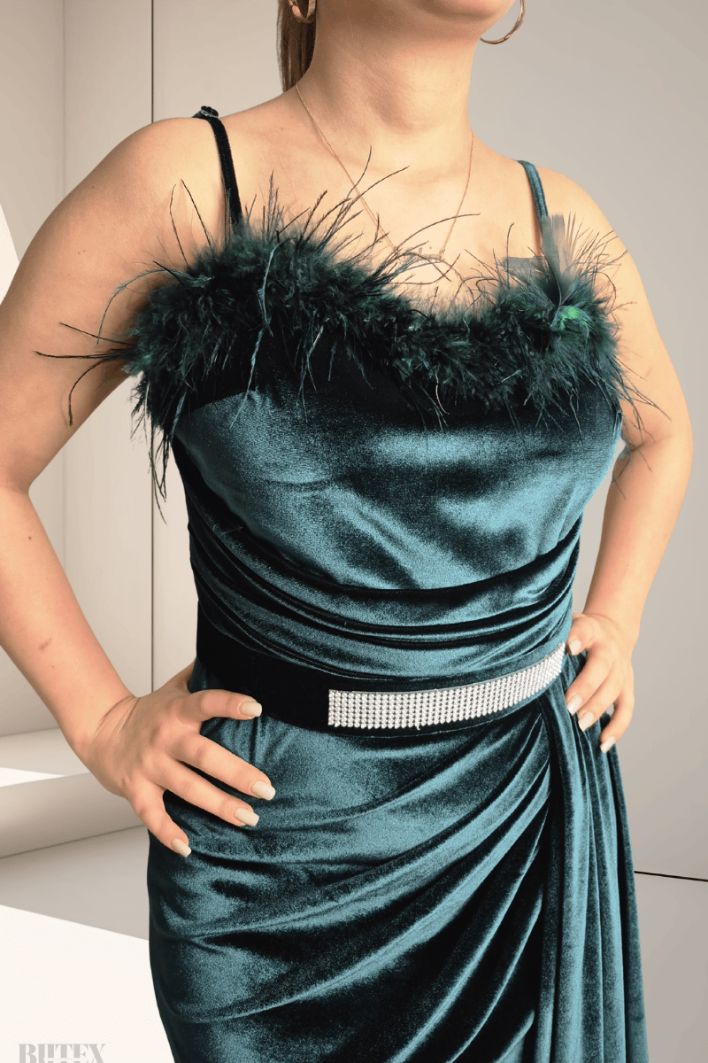 İp Askılı Göğsü Otrişli Uzun Kadife Abiye Elbise 9697btx