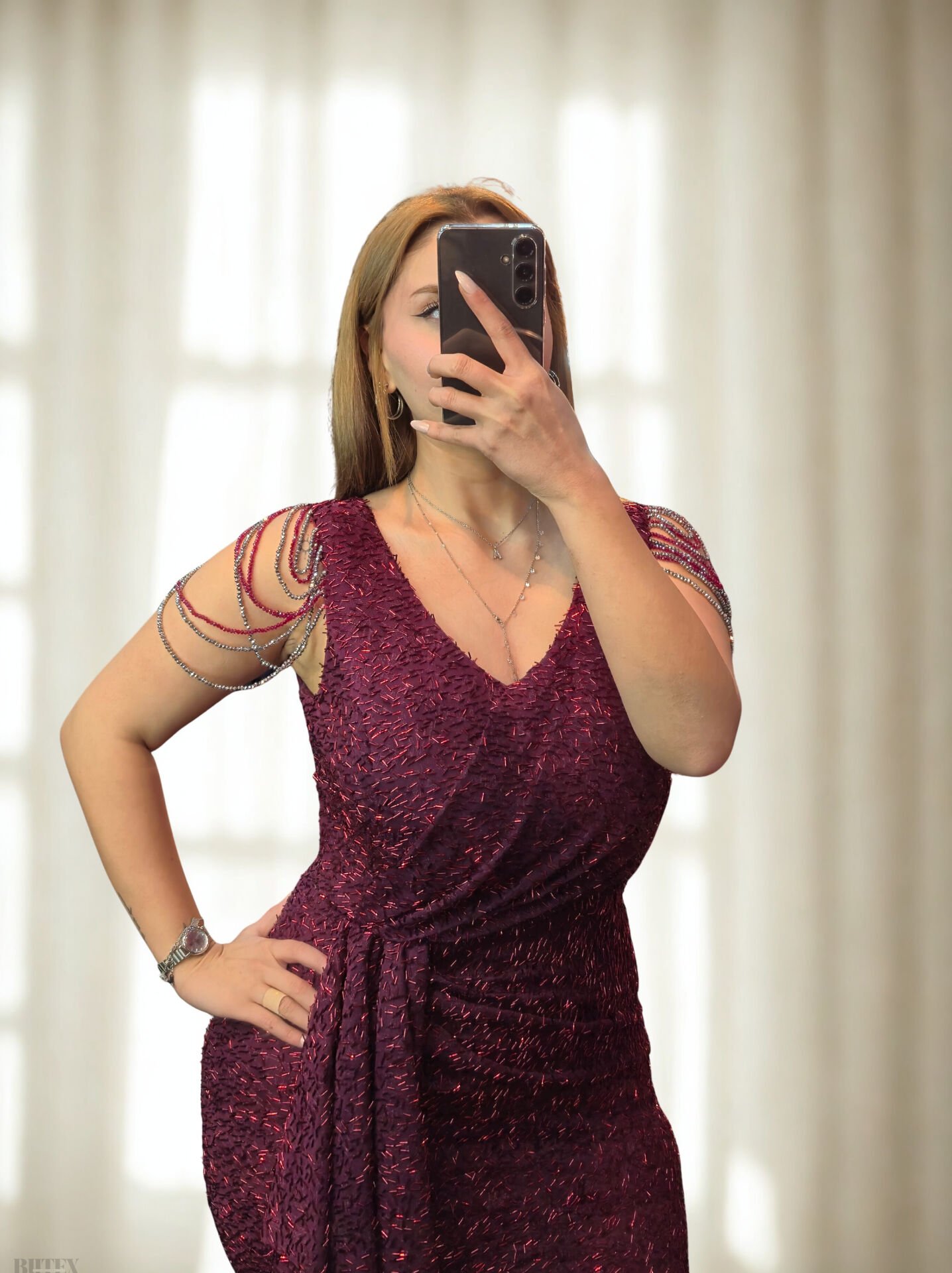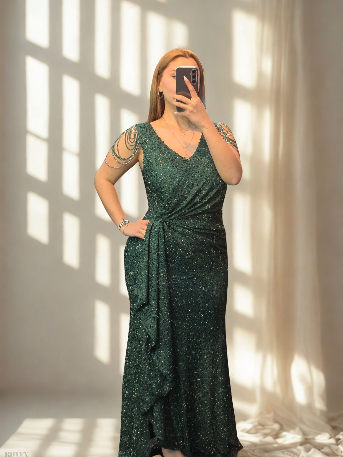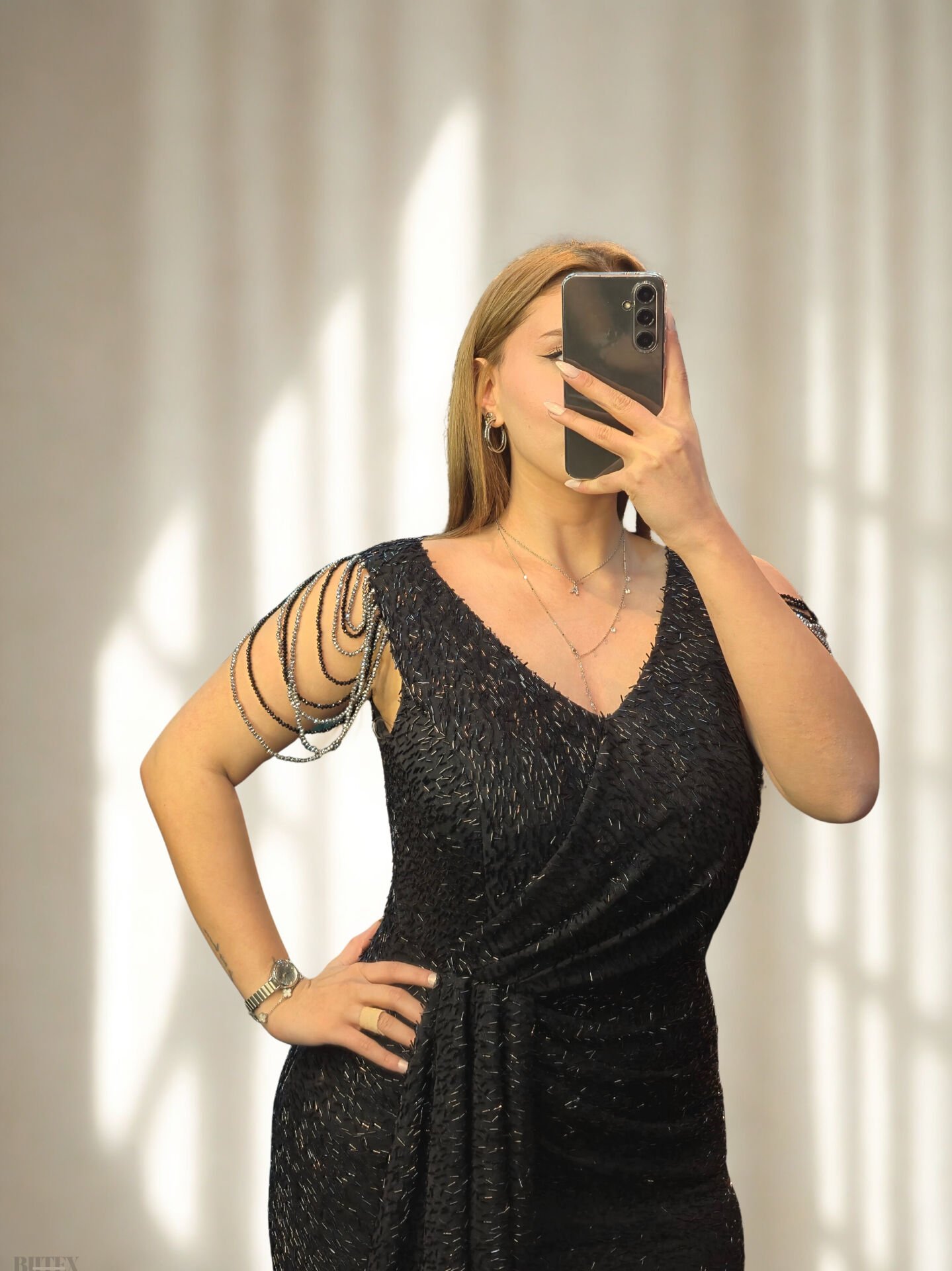Boncuk işlemeli büyük beden tasarım elbise, özel kalıp omuzları ve boncuk sarkıt detaylarıyla zarafet sunar. Basen kısmı drapeli yapısı ve göbek kamufle edici özelliğiyle vücut hatlarını kusursuz şekilde şekillendirir. Şıklığı ve rahatlığı bir arada arayanlar için ideal bir modeldir.