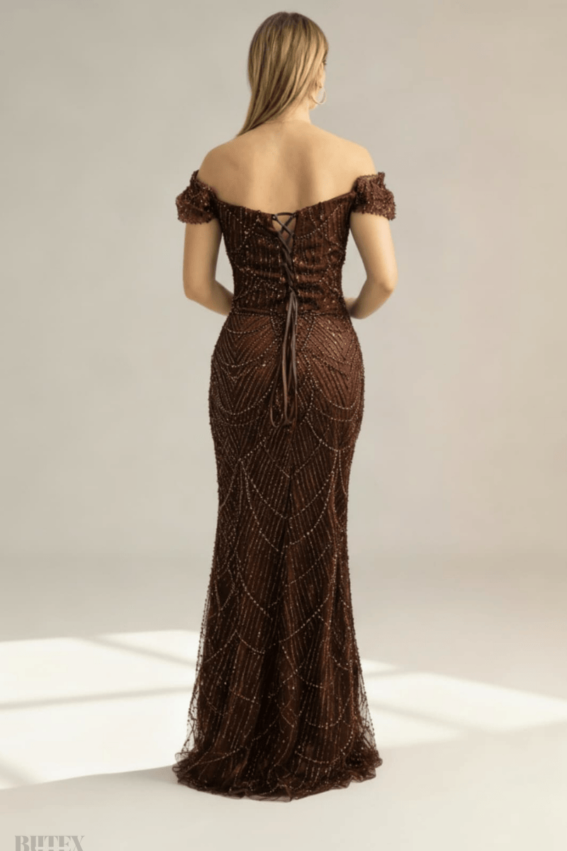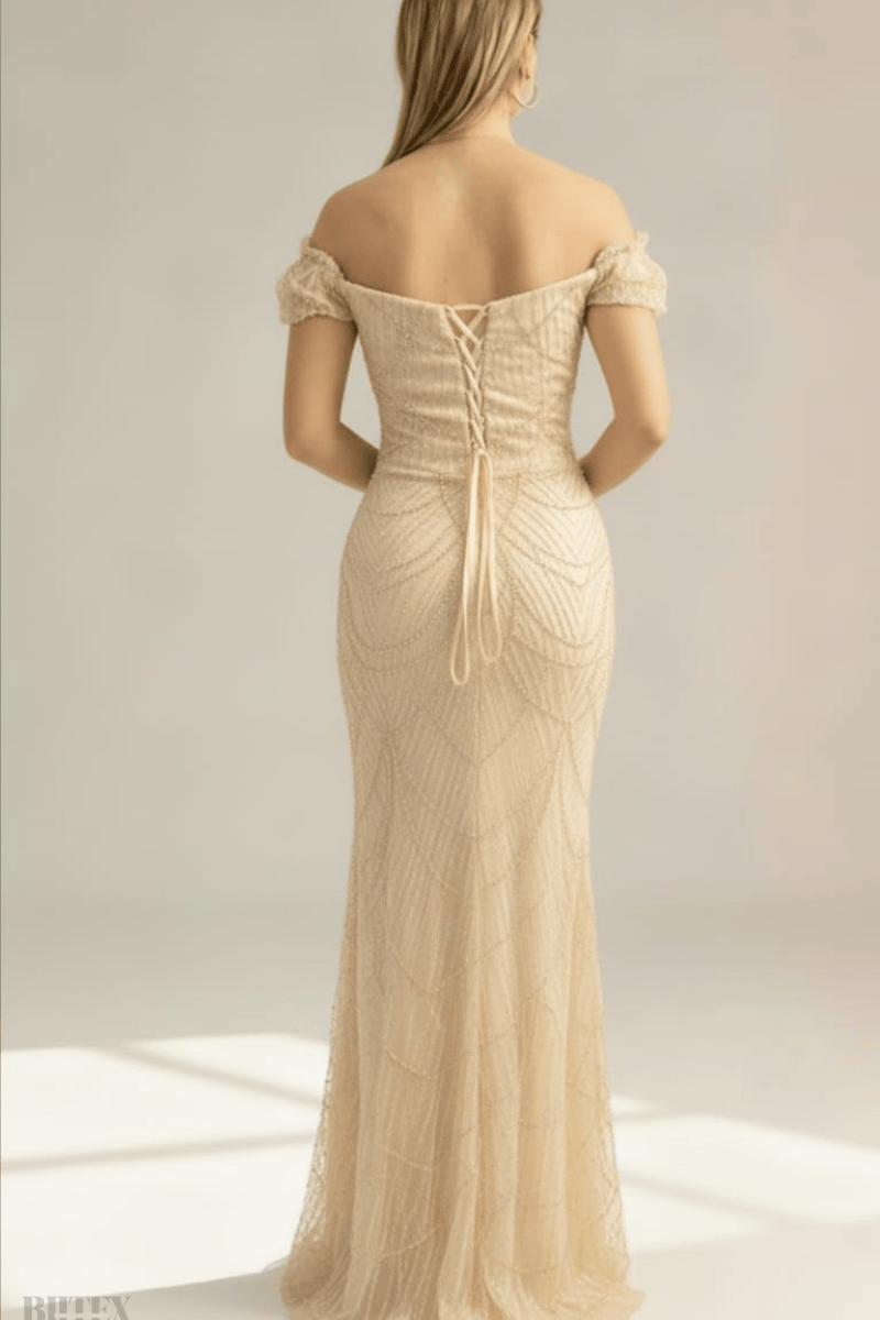Güneş desenli boncuk işlemeleriyle zarafet sunan abiye elbise, sırtı ip bağcıklı tasarımıyla şıklığı artırır. Madonna yaka ve balık model kesimi, vücuda oturarak özel günlerde dikkat çekici bir görünüm sağlar. Özel davetlerde stilinizi tamamlayacak eşsiz bir seçim.