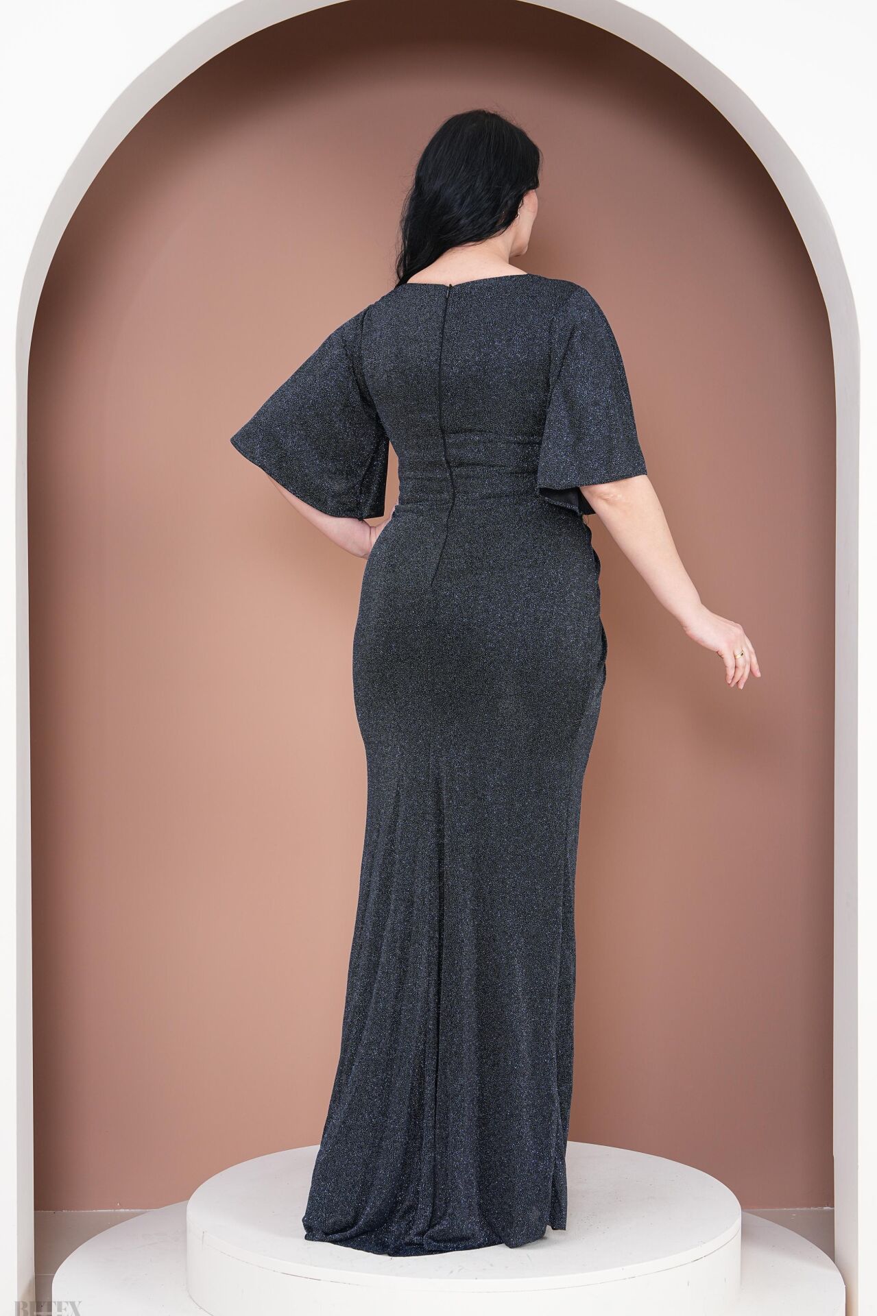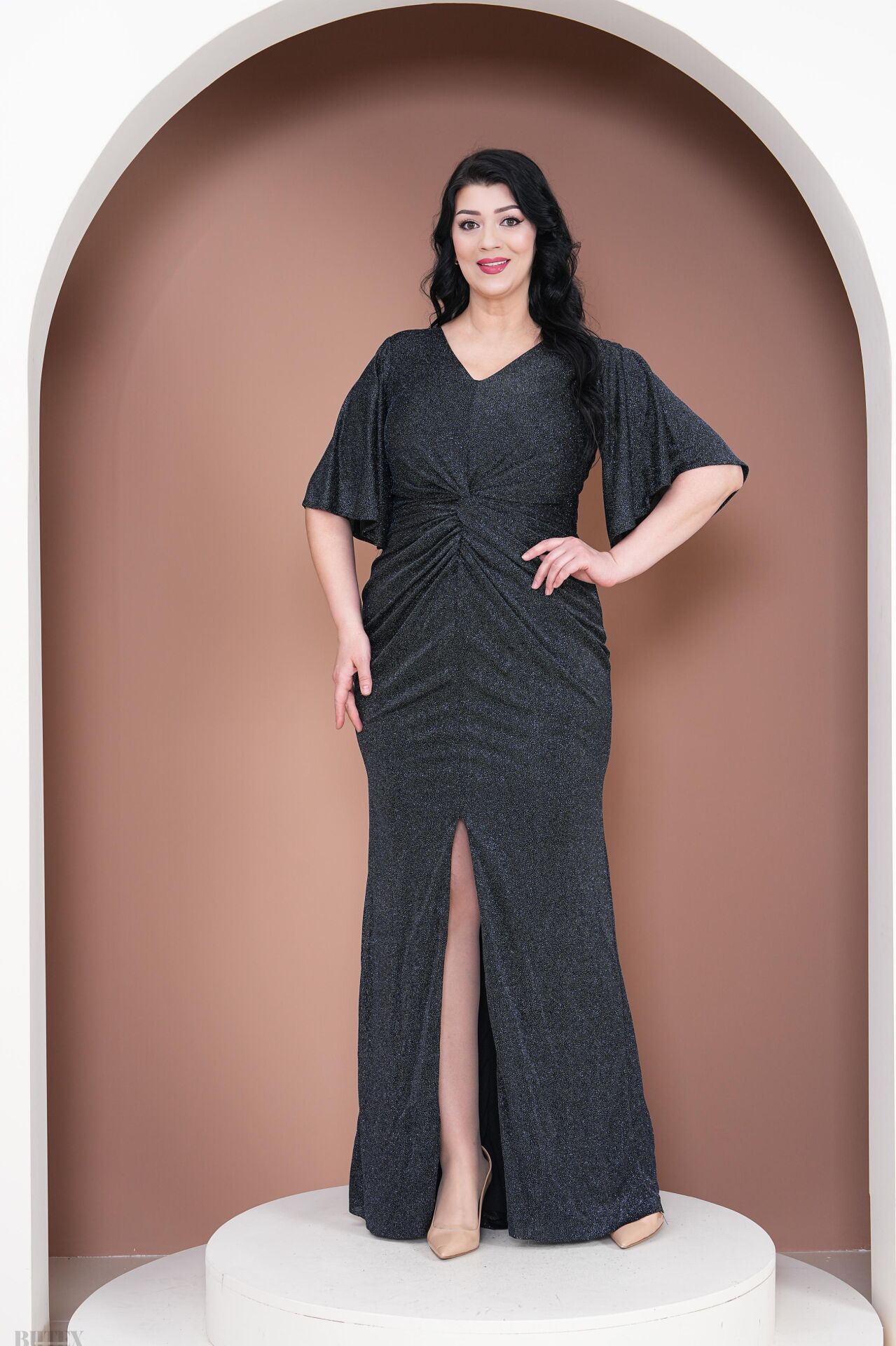 Önü Büzgülü Likralı Simli Kumaş Büyük Beden Abiye Elbise 3077BTX