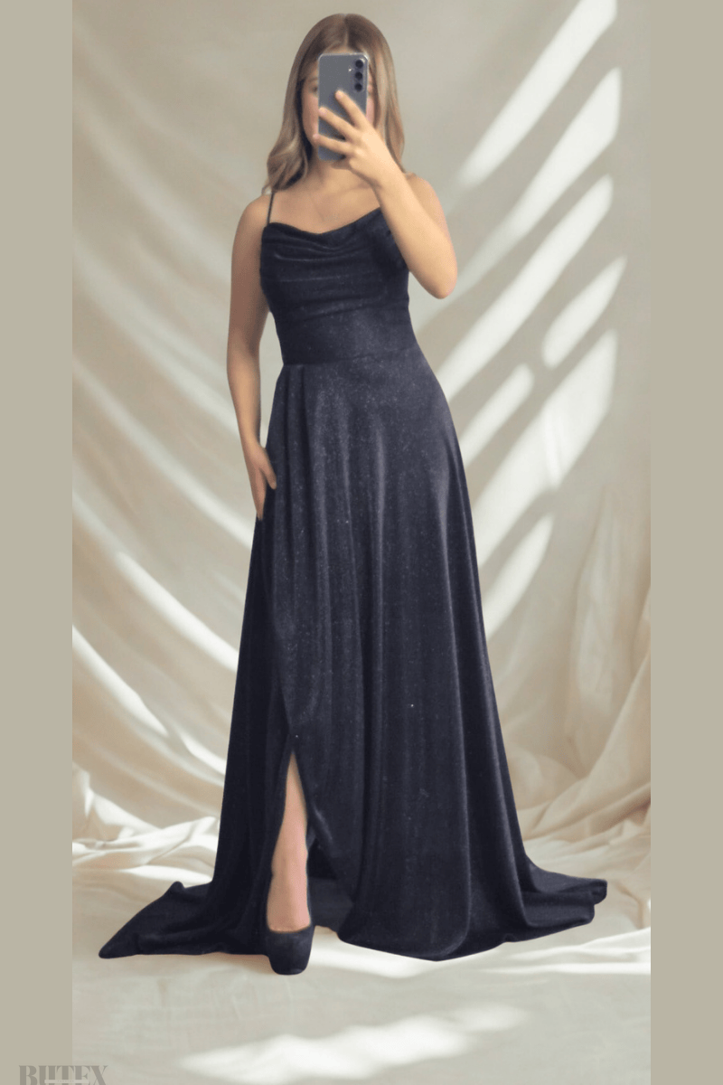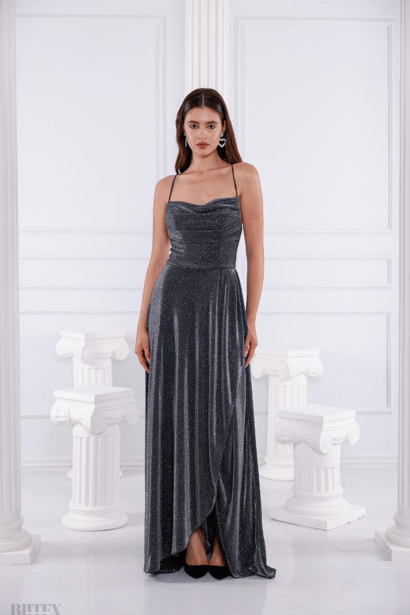 Sırtı İpli Volanlı Likralı Simli Kumaş Abiye Elbise 16796btx