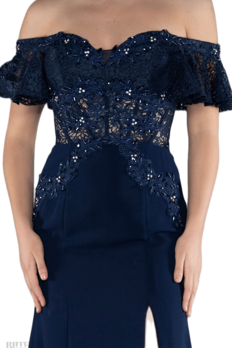 Üstü zarif dantel detaylarla süslenmiş, altı kaliteli krep kumaştan tasarlanan bu abiye elbise, şıklığı ve rahatlığı bir arada sunar. Derin yırtmaç ve sırtı bağcıklı tasarım, modern ve çekici bir görünüm sağlar. Özel davetler için ideal bir seçimdir.