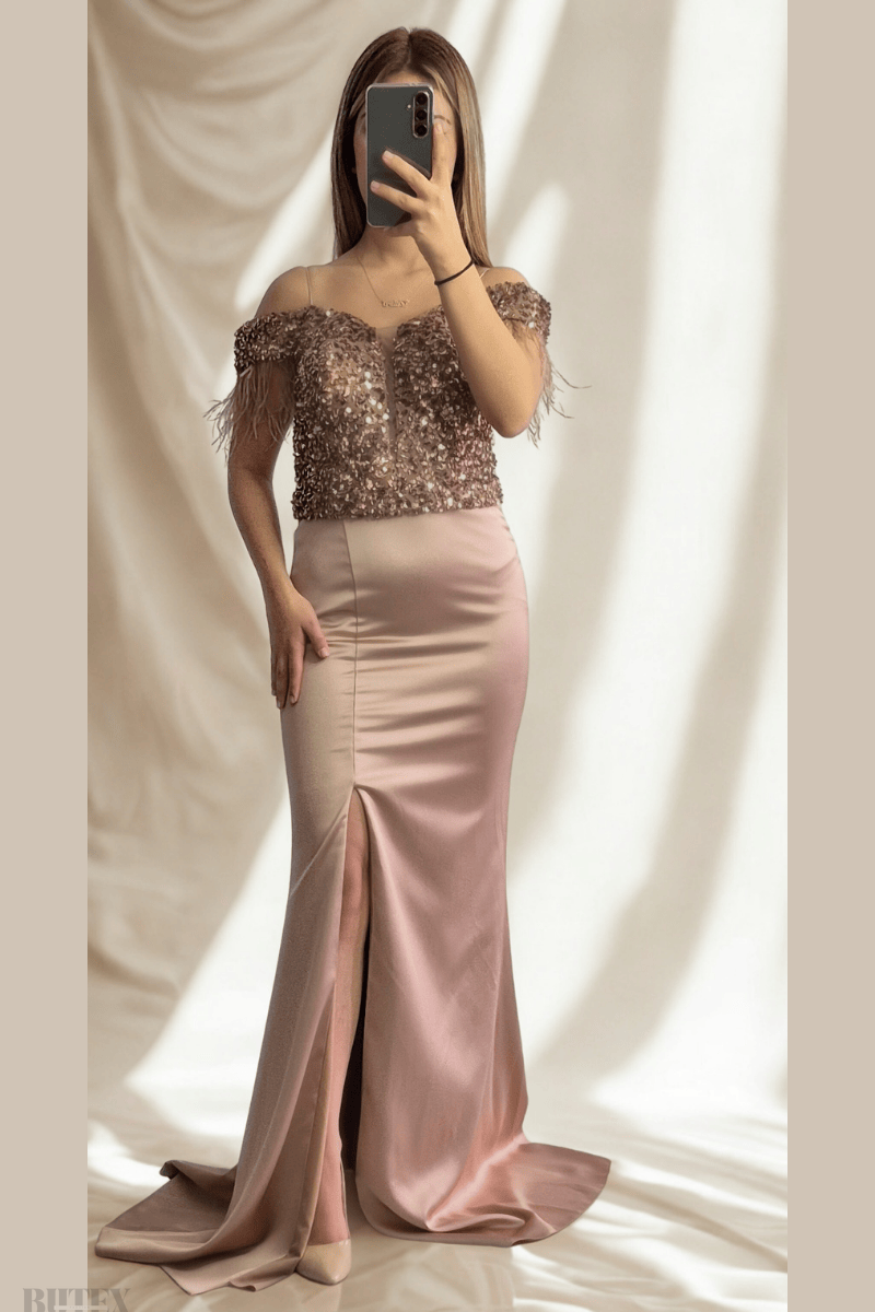 Bu muhteşem abiyenin üst kısmı payetlerle bezenmiş, alt kısmı ise satenden yapılmıştır. Balık kesim modeliyle vücudu saran elbise, zarif ve şık bir görünüm sunar. Aynı zamanda kolları tüy detaylı ve sırt kısmı ip bağcıklıdır. Her özel geceye mükemmel uyum sağlayacak bu elbise, sizin için ideal seçim olacaktır.BEDEN TABLOSU İÇİN TIKLAYINIZ