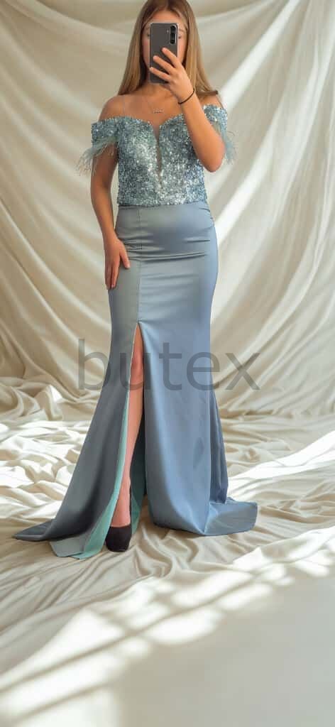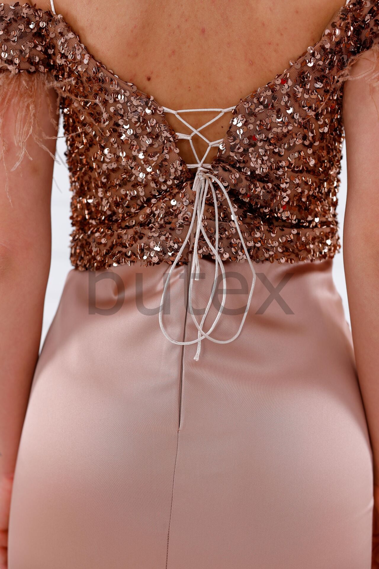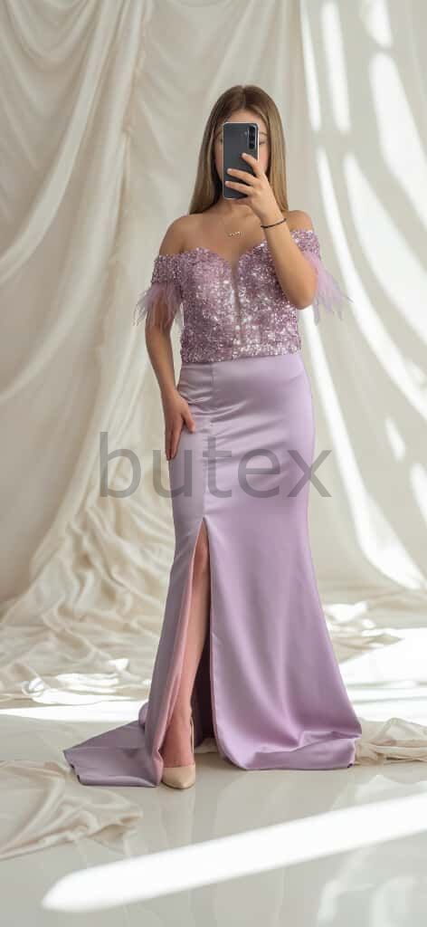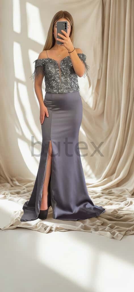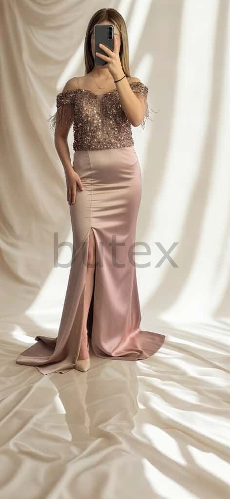 Üstü Payet Sırtı Bağcıklı Alt Kısmı Saten Kol Uçları Otrişli Uzun Abiye Elbise 1132btx